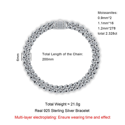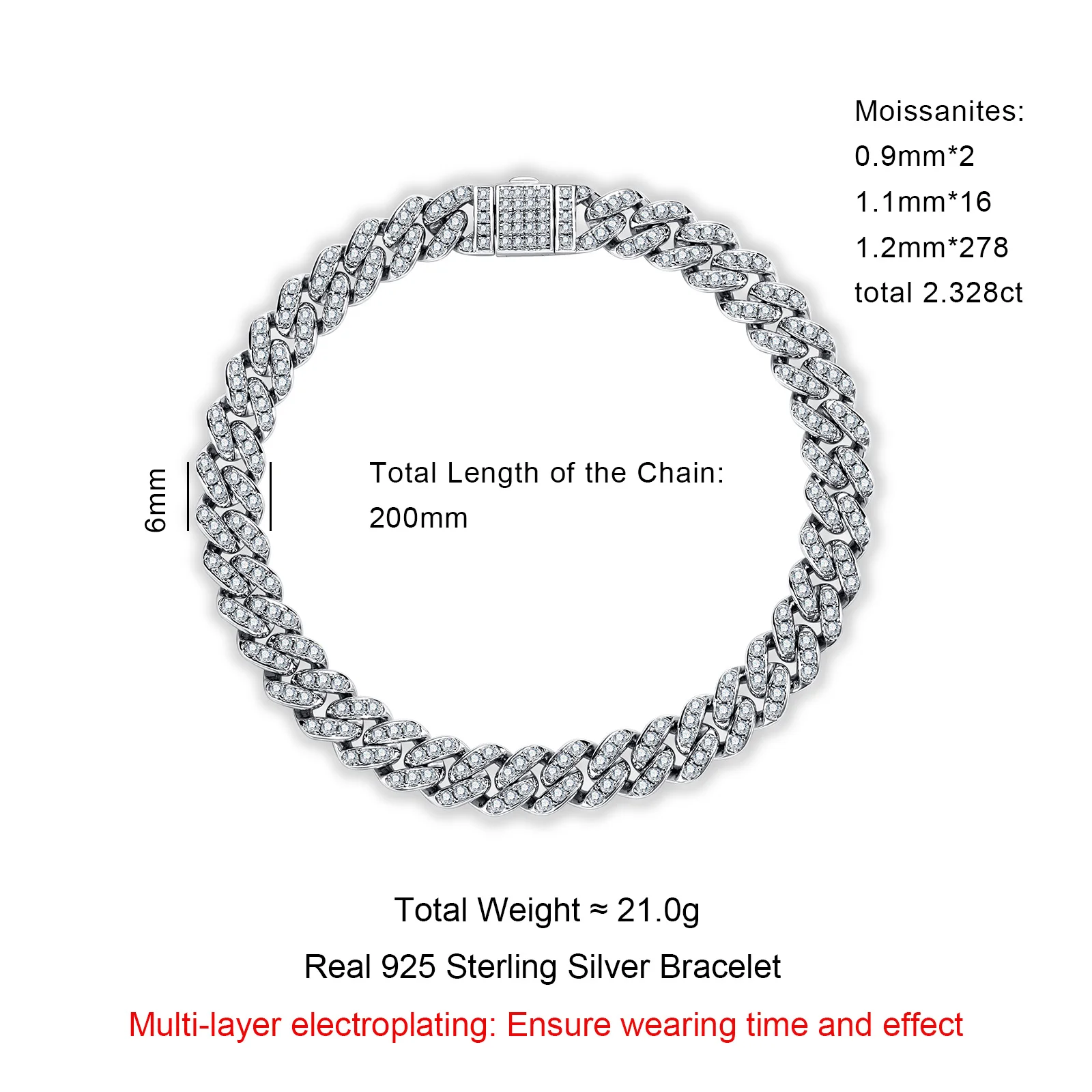 Moissanite Cuban Link Bracelet – 925 Silver Iced Out Hip Hop Jewelry - width 6mm / 6.3in(16cm)