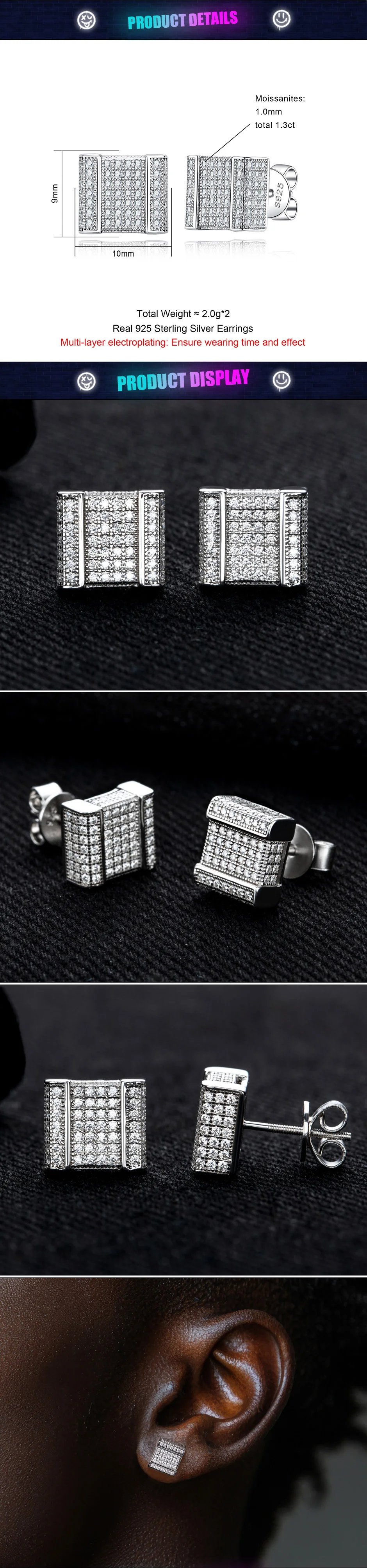 Add timeless elegance and bold shine to your style with the Moissanite Square Stud Earrings. Designed for both men and women, these earrings feature 1.3ct D-color VVS1 moissanite stones that deliver unmatched brilliance. Crafted from 100% 925 sterling silver, they combine luxury with durability for everyday wear or special occasions.