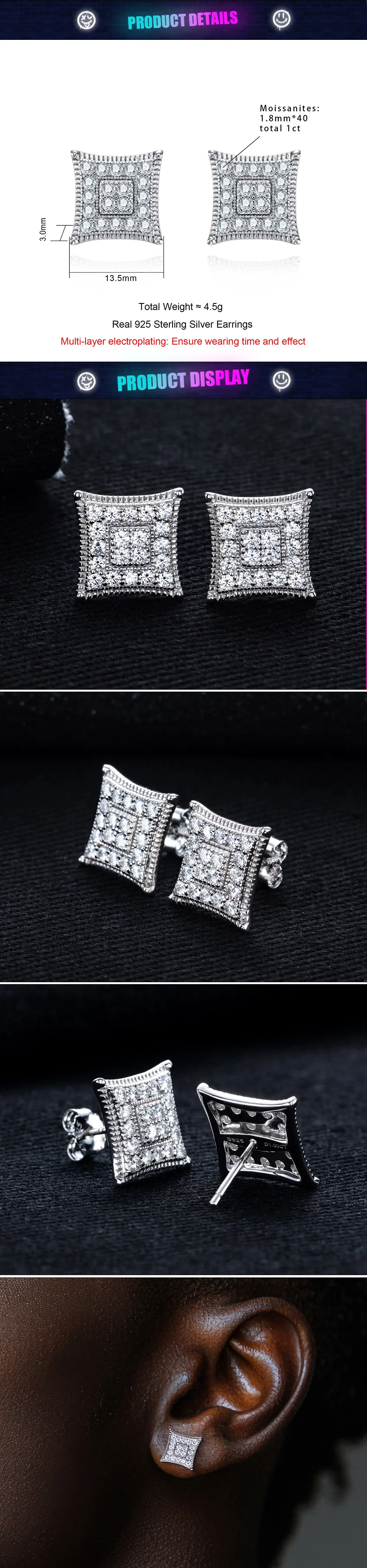Moissanite Square Stud Earrings – 925 Silver Iced Out Jewelry