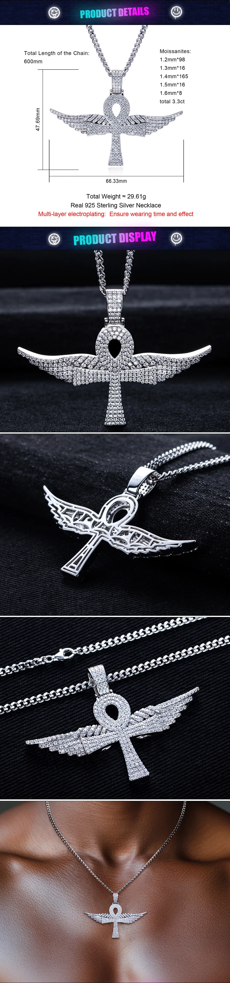 Moissanite Angel Wing Cross Pendant – 925 Silver Hip Hop Necklace Sale