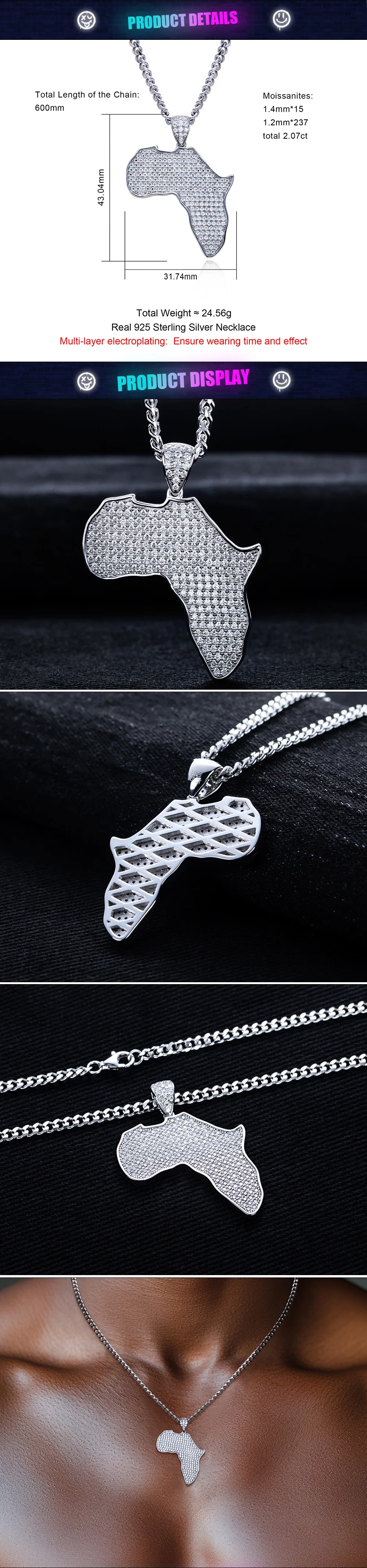 Show pride, power, and style with the Moissanite Africa Map Pendant, crafted for both men and women who love statement jewelry. This stunning iced-out piece features a finely detailed Africa map design, fully encrusted with D-color VVS1 moissanite for brilliant sparkle and depth.