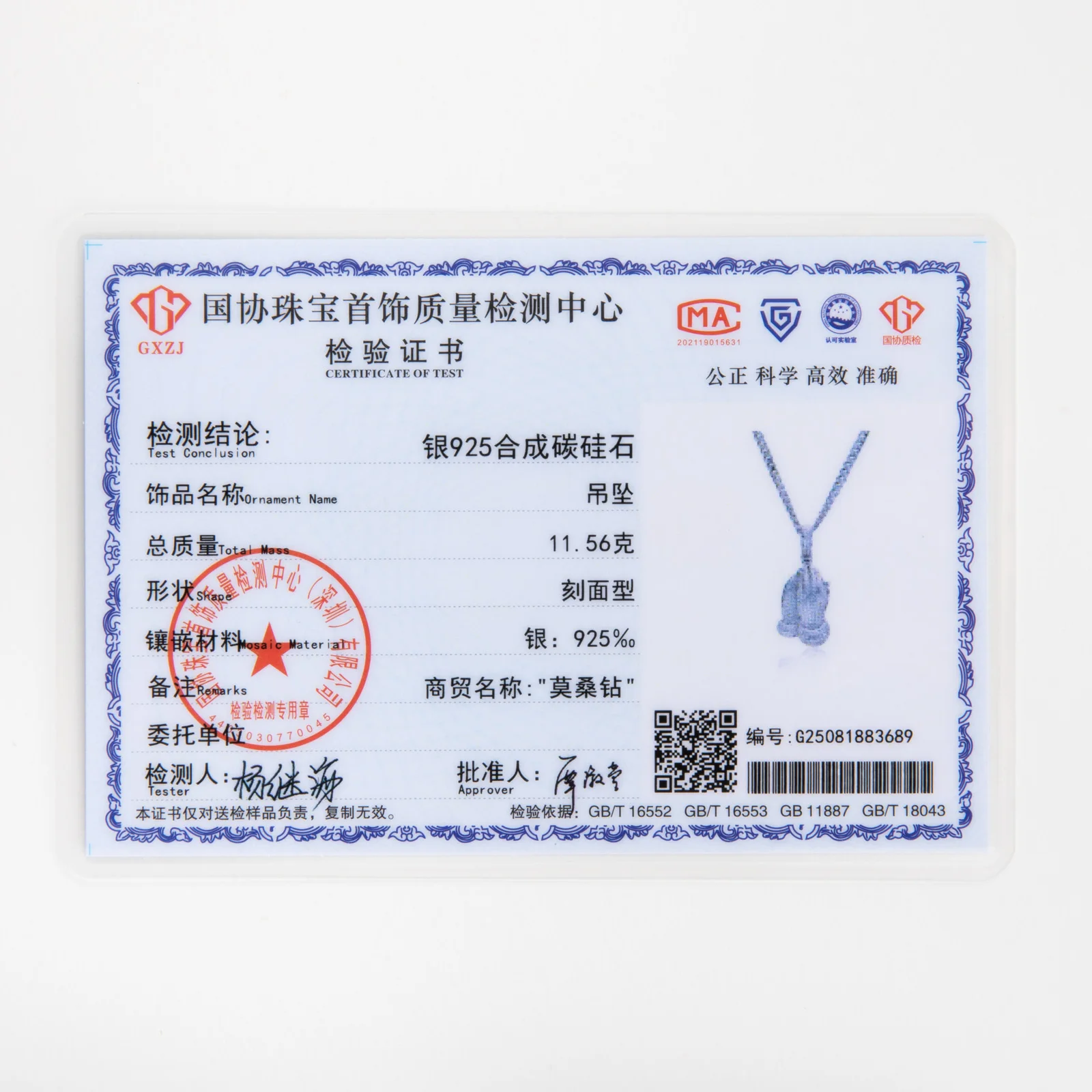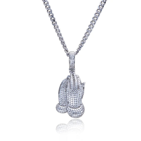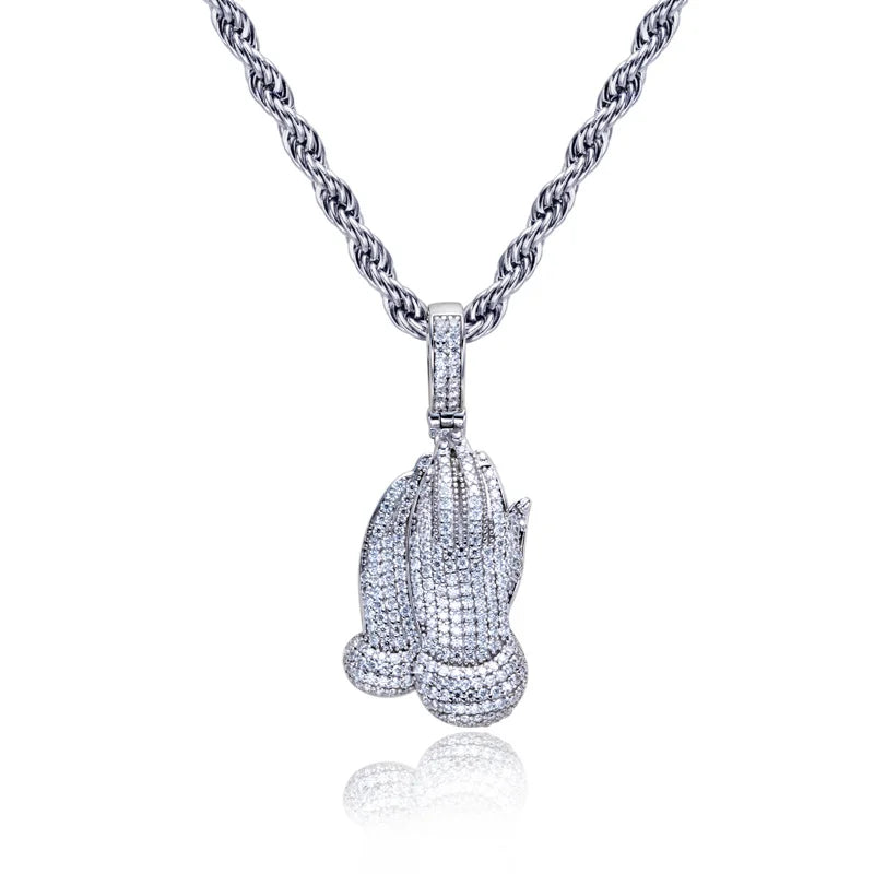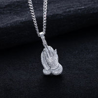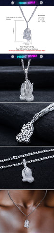 Each pendant is carefully set with D-color VVS1 moissanite stones, delivering exceptional brilliance and diamond-like fire. The detailed praying hand design embodies hope, gratitude, and strength, making it a meaningful accessory for any occasion.
