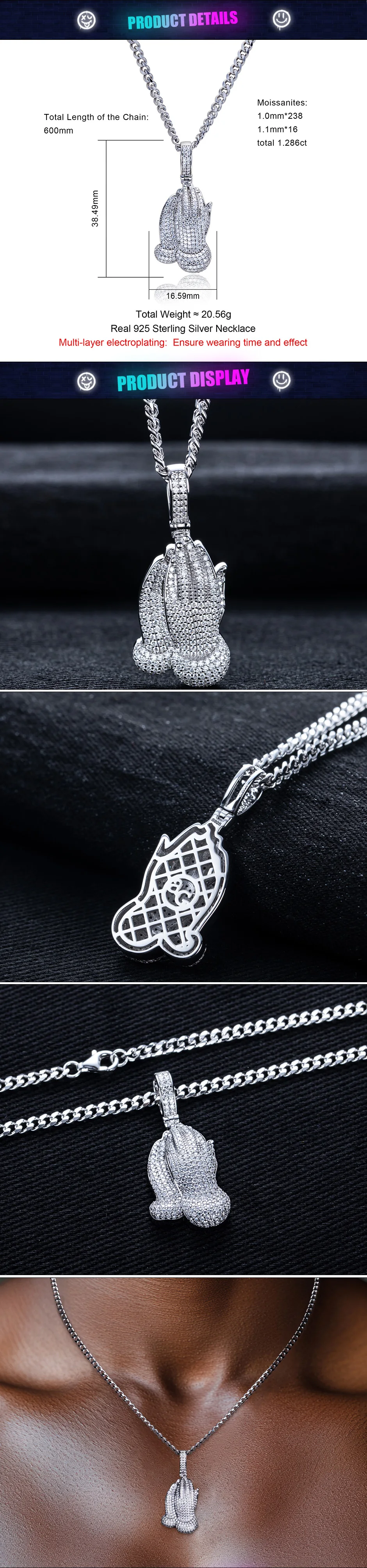 Express faith and fashion with the Moissanite Iced Out Praying Hand Pendant, a stunning piece that fuses spiritual symbolism with modern hip hop style. Handcrafted from 100% 925 sterling silver, this pendant offers lasting shine, durability, and comfort for daily wear.