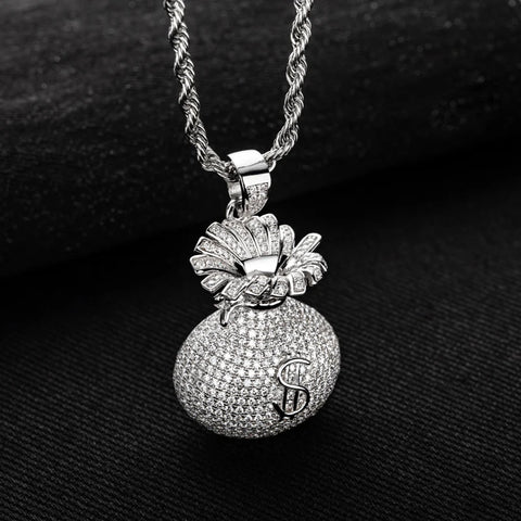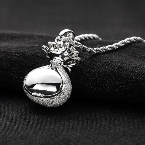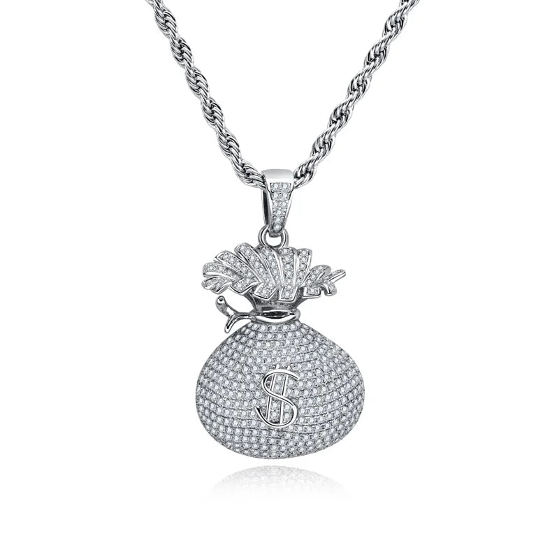 Bring bold luxury to your streetwear with the 6.1cttw Moissanite Money Bag Pendant Necklace. Designed to embody success and hustle, this iced-out money bag pendant delivers a perfect mix of symbolism, shine, and hip hop flair.