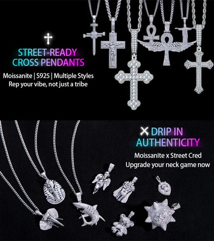 Make a bold statement with the Moissanite Bling Cross Pendant Necklace, expertly crafted from genuine 925 sterling silver and set with sparkling VVS1 D-Color moissanite stones. Designed in a striking iced-out style, this pendant merges cross symbolism with modern hip hop and punk-inspired fashion, creating a powerful and stylish accessory for both men and women.